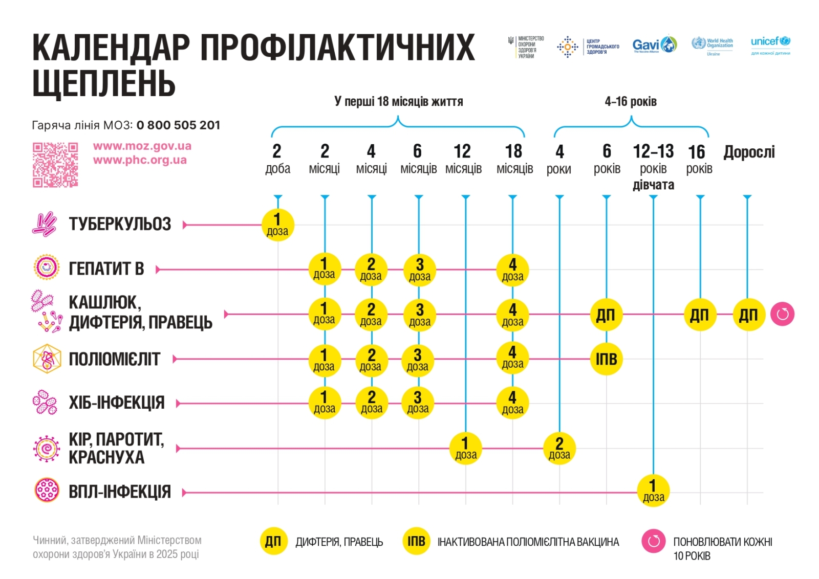- 2, 4 та 6 місяців — перша, друга і третя дози щеплення комбінованою вакциною проти гепатиту В, Hib-інфекції, кашлюка, дифтерії та правця (КДП+Hib+ВГВ), а також — інактивованою поліомієлітною вакциною. Завдяки використанню комбінованої вакцини зменшується загальна кількість ін’єкцій для дитини та кількість уколів під час візитів до медзакладу.