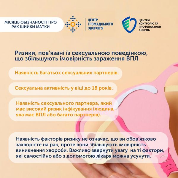 На інфографіці — основні фактори ризику розвитку раку шийки матки. Але пам’ятайте, що наявність факторів ризику не означає, що ви обов’язково захворієте на рак, проте вони збільшують ймовірність виникнення хвороби. Тому важливо звернути увагу саме на ті фактори, які самостійно або з допомогою лікаря можна усунути.