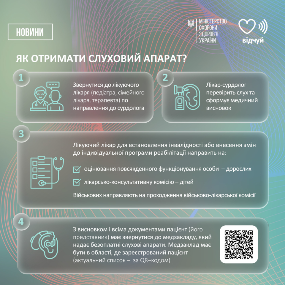 Крім того, МОЗ разом із ГО «Відчуй», розробили зручний путівник, у якому покроково описано, як отримати слуховий апарат у вашому регіоні. Його можна знайти за посиланням: https://bit.ly/4kmRsk0